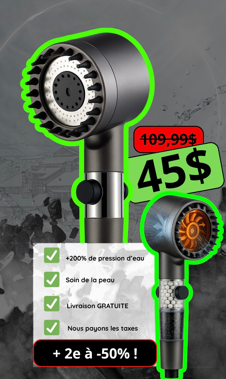 Une pression augmentée de +200% pour un lavage en profondeur, accompagnée nos filtres au charbon qui éliminent le chlore et les produits chimiques responsables des éruptions cutanées et des dommages à la peau.